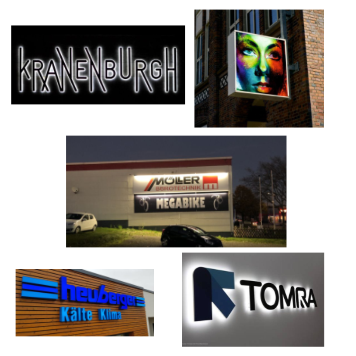 - Ob mit Leuchtbustaben, hinterleuchteten Buchstaben, gefrästen Buchstaben aus verschiedenen Materialien,